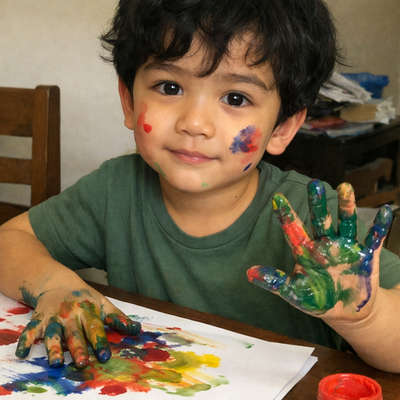 Lukas bindet sich die große blaue Schürze um den Bauch. Sie reicht ihm fast bis zu den Füßen, aber das macht nichts. Heute ist ein besonderer Tag. Heute backt Lukas ganz alleine einen Schokoladenkuchen! Er klettert auf den kleinen Hocker vor der Küchentheke und streckt sich nach dem Mehl. Die Tüte ist schwerer, als er gedacht hat. Er zieht und zieht – und plötzlich rieselt eine weiße Wolke durch die Luft. Mehl landet auf seiner Nase, auf dem Boden, sogar auf der Katze, die erschrocken davonspringt. „Nicht schlimm", murmelt Lukas und wischt sich die Hände an der Schürze ab. Er greift nach dem Kakao. Der dunkle Duft kitzelt in seiner Nase, süß und warm. Vorsichtig schüttet er einen Löffel in die Schüssel. Dann noch einen. Und noch einen – denn je mehr Schokolade, desto besser, oder? Jetzt die Eier. Lukas klopft das erste Ei gegen den Schüsselrand. Es macht ein leises *Knack* – doch statt in die Schüssel gleitet es ihm durch die Finger und landet mit einem glitschigen *Platsch* auf dem Boden. Lukas schaut nach unten. Sein Lächeln wird etwas kleiner…